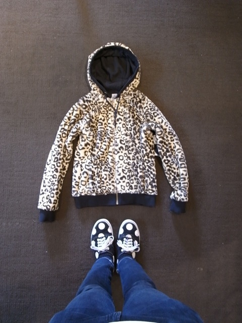 ヒョウ柄プリントのフェイクファーものです、コレ。